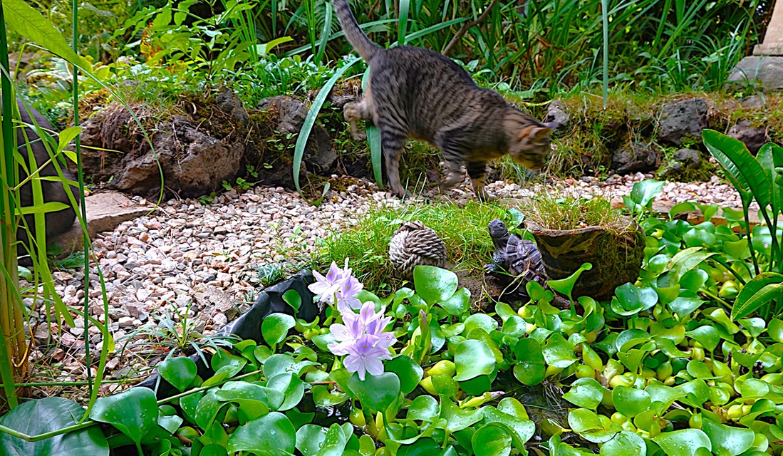 8月27日 裏庭の池のホテイアオイが開花しました 未分類 2025.08.28 裏庭の池のホテイアオイが開花しました。池を新しくしてから初めての開花です。 ホテイアオイは日当たりが必要なので、年によっては開花しないときもありましたが、今年はすでに6株の開花を確認しています。 ホテイアオイが増えすぎたので、開花前に半分間引きしました。 池を覆うホテイアオイ。これでも半分間引いた後です。 大きい葉はナガバオモダカです。 ホテイアオイは一日花なので、開花の次の日はしぼんでしまいます。 でも次の株が花芽を膨らませています。