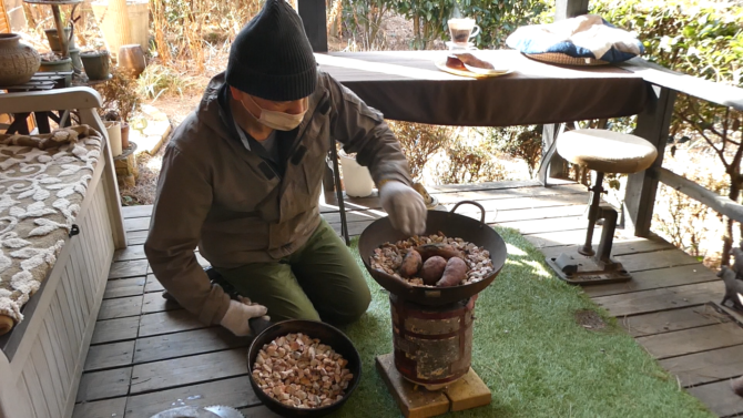 七輪で石焼き芋を作っています。