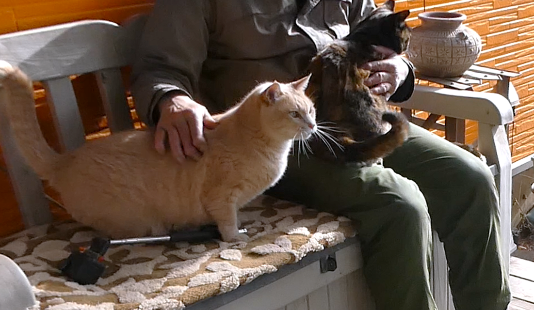 上の写真は、デッキで石焼き芋やおでんを作りながら、つづらとりんを抱いて日向ぼっこをしているところです。