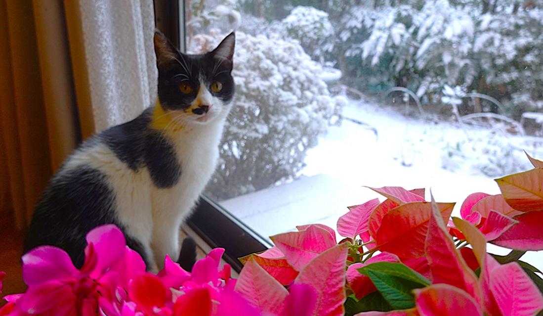 サキ君の手の鉢花は、シクラメンとポインセチアです。
