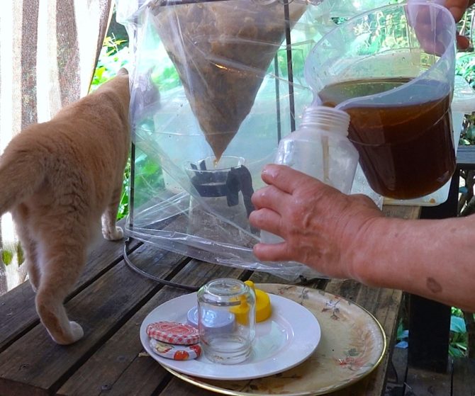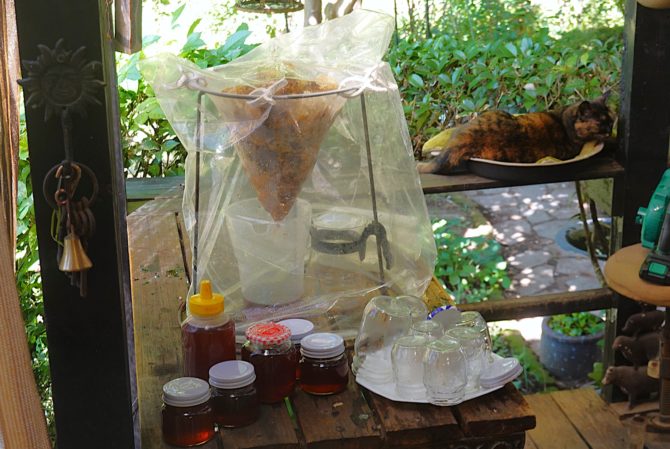 ハチミツをろ過中。ひと箱で4キロのハチミツがとれました。