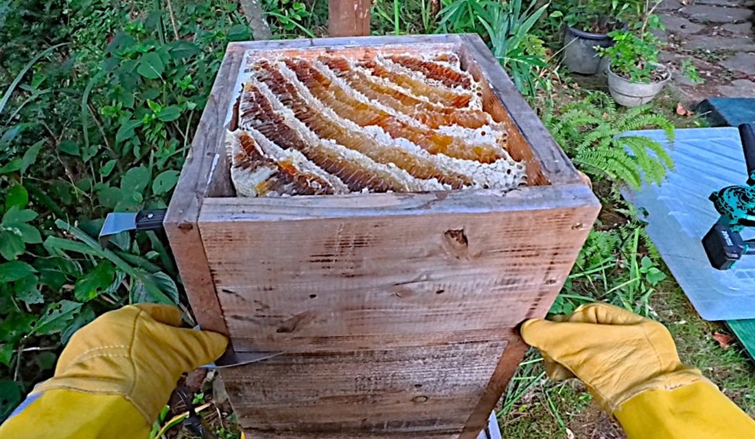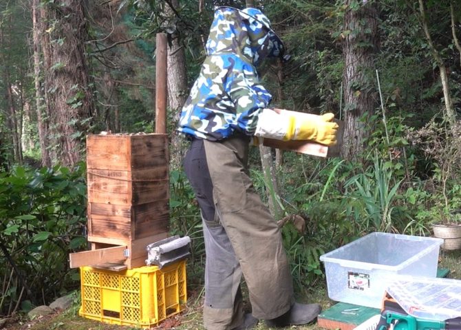最上段の巣箱を一段だけ採蜜します。残りはミツバチの冬場の食糧のために残しておきます。巣板が底板に届きそうになってきたので、継ぎ箱もしました。